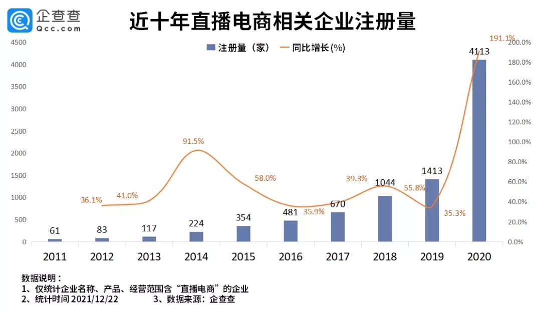 從直播電商相關(guān)企業(yè)發(fā)展?fàn)顩r來(lái)看,企查查數(shù)據(jù)顯示,近幾年企業(yè)注冊(cè)量不斷增長(zhǎng),這兩年行業(yè)更是迎來(lái)大爆發(fā)。2020年注冊(cè)量為4113家,同比增長(zhǎng)了191.1%。從今年的注冊(cè)量來(lái)看,2021年至今共新注冊(cè)了8364家,同比上漲了103.4%。