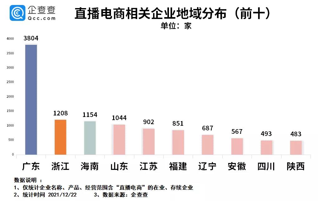 從地域分布來(lái)看,企查查數(shù)據(jù)顯示,目前我國(guó)在業(yè)、存續(xù)的直播電商相關(guān)企業(yè)主要分布在廣東、浙江、海南等省份。其中廣東省的企業(yè)量排名全國(guó)第一,為3804家。此外,浙江、海南直播電商相關(guān)企業(yè)分別為1208家、1154家,分列二三位。
