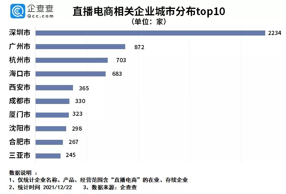 從城市分布來(lái)看,企查查數(shù)據(jù)顯示,直播電商相關(guān)企業(yè)數(shù)量排名前三的城市是深圳市、廣州市、杭州市,分別有企業(yè)2234家、872家、703家。其次是海口、西安、成都、廈門、沈陽(yáng)等城市。
