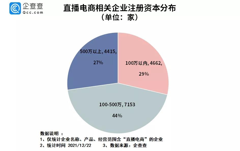 從注冊(cè)資本分布來(lái)看,企查查數(shù)據(jù)顯示,我國(guó)直播電商相關(guān)企業(yè)中有29%的企業(yè)注冊(cè)資本在100萬(wàn)以內(nèi),注冊(cè)資本在100萬(wàn)-500萬(wàn)之間的占比44%,注冊(cè)資本在500萬(wàn)以上的企業(yè)最少,占比27%。